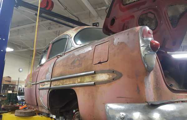 I am a Highschool Autoshop teacher and I wanted a cool project to do with my students. I looked up on the Kijiji old classic cars and this 53 Chevy came up in the fastest patina color possible, red, and a 68 mustang coupe that were in my price range. I looked at this BelAir first and the Mustang second, I was actually about the buy the Mustang, but a forklift driver put the forks through the block and the firewall, so fate sent me back to the BelAir which I actually liked more anyways.