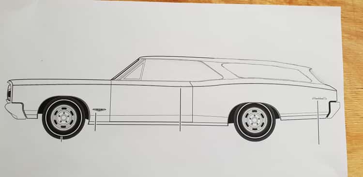 This was a first for me. Eventhough I had never drew or make a car design before, I drew it out. It took several weeks to figure out exactly the right lines. With such an overhang on the back, it was tough.